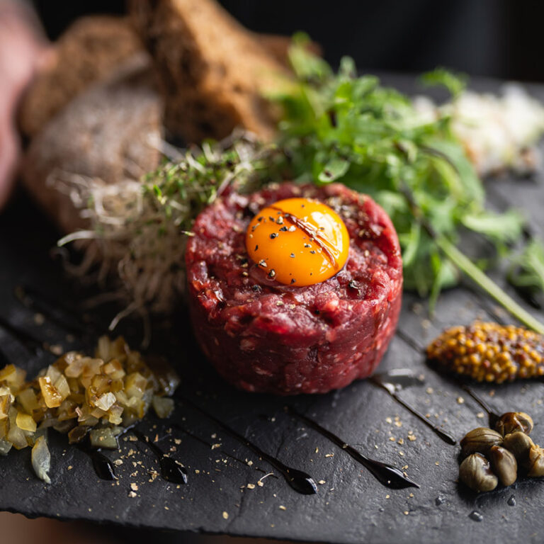 mięso wołowe, ogórek kiszony, cebulka, kapary, musztarda francuska, podawany z chlebem
