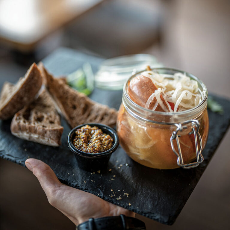 parówka marynowana z cebulą, czosnkiem oraz papryką pepperoni w occie, podawana z musztardą francuską i pieczywem