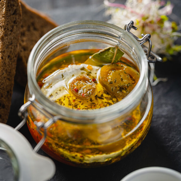 ser cammembert marynowany z cebulą i czosnkiem oraz papryką pepperoni w oliwie z oliwek, podawany z sosem tatarskim i pieczywem