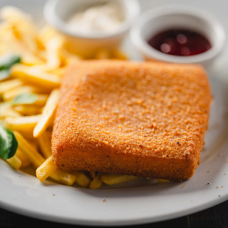 ser żółty panierowany, podawany z frytkami, żurawiną i sosem tatarskim