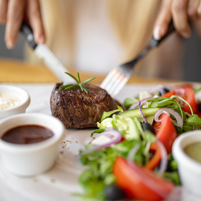 steak z polędwicy wołowej, mięso dojrzewające, sałatka grecka, frytki stekowe, sos tatarski, sos BBQ, sos sałatkowy, sos wiśniowy