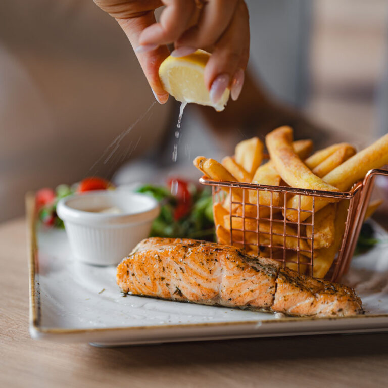 grillowany łosoś z sałatką, frytkami stekowymi, sosem tatarskim i sosem sałatkowym